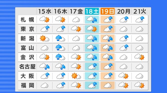 土曜日と日曜日は広い範囲で再び傘の出番となる見込みです。