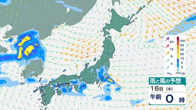 ニュースクリップ 【気象情報】近畿地方は14日夕方から15日明け方にかけて竜巻などの激しい突風や落雷、急な強い雨に注意【雨と風のシミュレーション(日本付近)】 2025年10月14日(火) 11:50 国内 天気 16日(木)雨と風のシミュレーション
