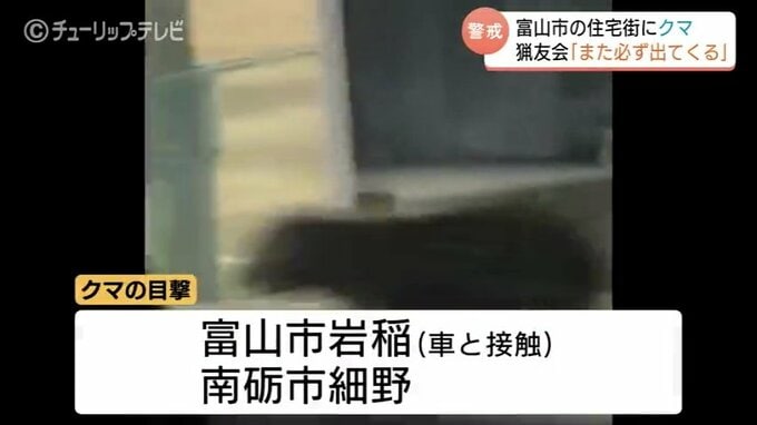 富山県内では14日富山市のほか南砺市細野でも成獣とみられるクマが目撃されています。