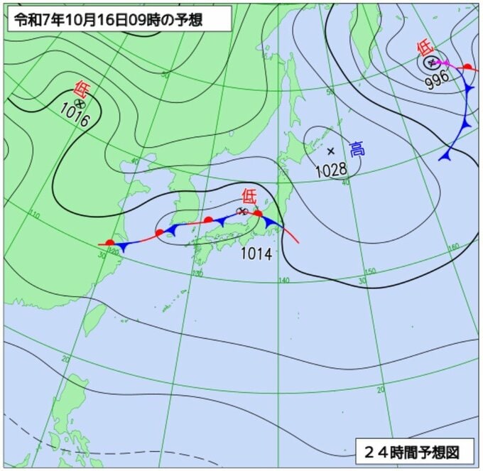 気象庁によりますと、西日本から東海道沖には前線が停滞しています。前線は次第に西日本から東日本を北上し、16日(木)には前線上の日本海に低気圧が発生して、北陸地方を通過する見込みです。前線や低気圧に向かって暖かく湿った空気が流れ込むため、北陸地方では大気の状態が不安定となり、雷を伴って非常に激しい雨が降り、大雨となる所があるでしょう。