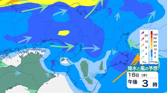 近畿地方では前線や低気圧に向かって暖かく湿った空気が流れ込んでいるため、16日夜遅くにかけて大気の状態が非常に不安定となり、局地的に雷雲が発達するでしょう。