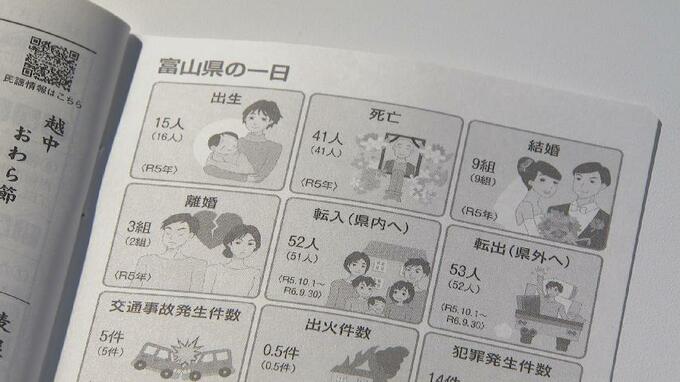 手帳に付随する別冊には「富山県の1日」をテーマに様々な統計データが掲載されており、中には1日あたりの結婚は9組・離婚は2組、といったユニークな情報も含まれています。