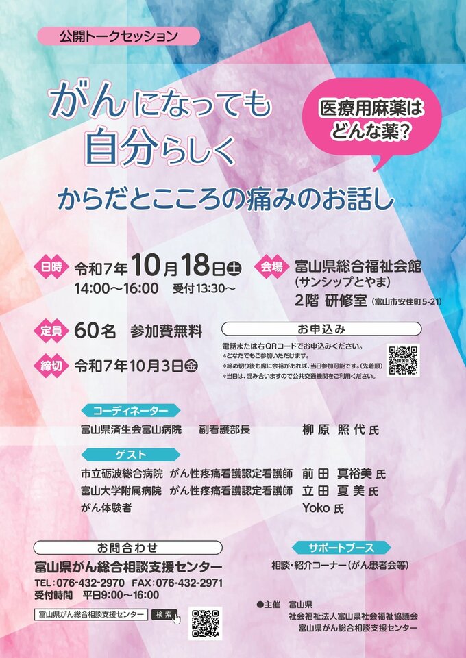 がん治療による “からだ” と “こころ” の痛みを和らげ、病気になっても自分らしく生きることを話し合う公開トークセッション「がんになっても自分らしく~からだとこころの痛みのお話し~」が10月18日(土)午後、富山市で開催されます。