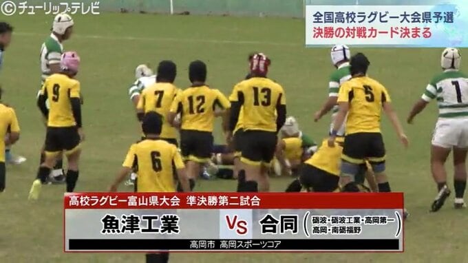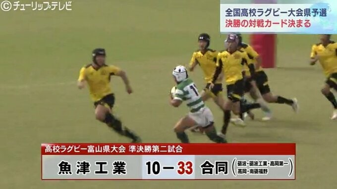 前半、合同が立て続けに2つのトライをあげリードする展開に。魚津工業も食らいつきますが、後半もじわじわと得点を重ねた合同が逃げ切り2大会ぶりの決勝進出です。
