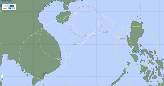 台風の予報進路は、予報の期間が長くなるほど誤差の幅(予報円)が大きくなります。最新の情報を確認するようにしてください。