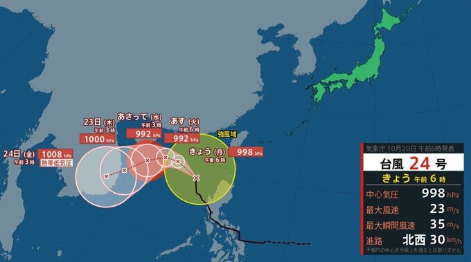 気象庁によりますと、台風24号は20日午前6時現在、南シナ海の北緯17度40分、東経117度35分を時速30kmで北西に進んでいます。中心気圧は998hPa、中心付近の最大風速は23m/s、最大瞬間風速は35m/sとなっています。
