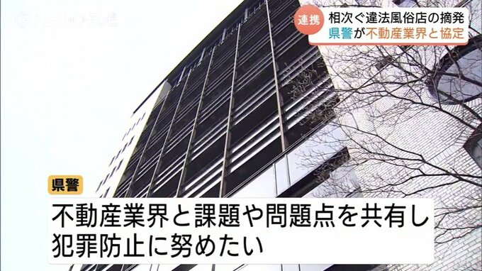 違法な風俗営業のほか特殊詐欺の拠点や薬物の保管場所としてアパートなどが利用されるケースが懸念されることから協定では、警察と不動産業界の連携、情報共有の推進を図るほか協会が主催する研修会に警察官を講師として派遣することなどが盛り込まれています。