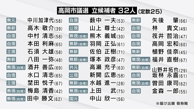 条例改正により、前回選から2議席減った定数25に対し、現職20人、元職3人、新人9人の32人が立候補しました。
