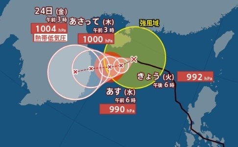 ▼22日午前6時の予報では、引き続き南西に時速10kmで進み、中心気圧が990hPaまで低下、中心付近の最大風速30m/s、最大瞬間風速40m/sとさらに勢力が強まる見通しです。