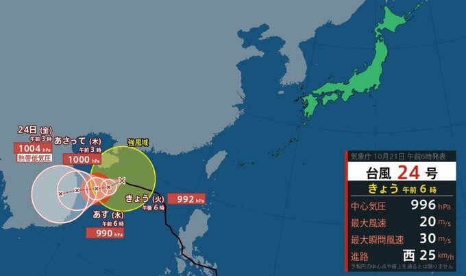 気象庁が21日午前6時50分に更新した台風の進路情報によりますと、台風24号は21日午前6時現在、南シナ海を西に時速25kmで進んでいます。中心気圧は996hPa、中心付近の最大風速は20m/s、最大瞬間風速は30m/sとなっています。強風域は北側390km、南側330kmに広がっています。