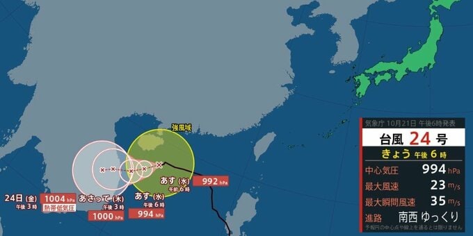 気象庁によりますと、台風24号は21日午後6時現在、南シナ海にあり、北緯17度40分、東経111度40分に位置しています。中心気圧は994hPa、中心付近の最大風速は23m/s、最大瞬間風速は35m/sとなっています。
