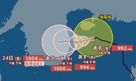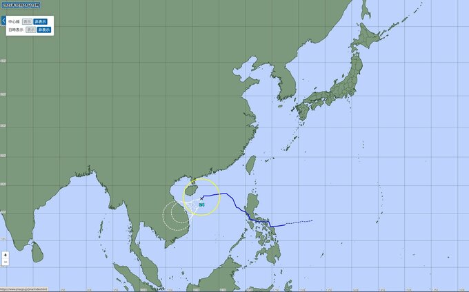 台風24号は今後、南西進を続けた後、23日にはベトナムに上陸し、24日にはラオス付近で熱帯低気圧に変わる見込みです。