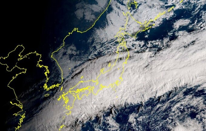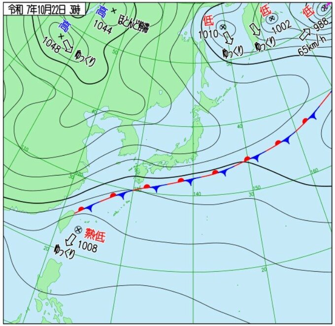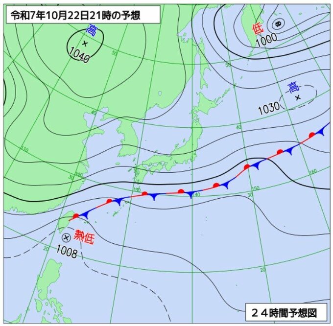 気象庁によりますと、22日は前線が台湾付近から種子島・屋久島付近、伊豆諸島付近を通って、日本のはるか東にほとんど停滞しています。