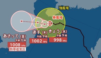 ▼24時間後の23日午前9時の予報では、引き続き南シナ海を西南西に時速15kmで進み、中心気圧は1002hPaまで上昇し、中心付近の最大風速は18m/s、最大瞬間風速は25m/sまで弱まる見込みです。