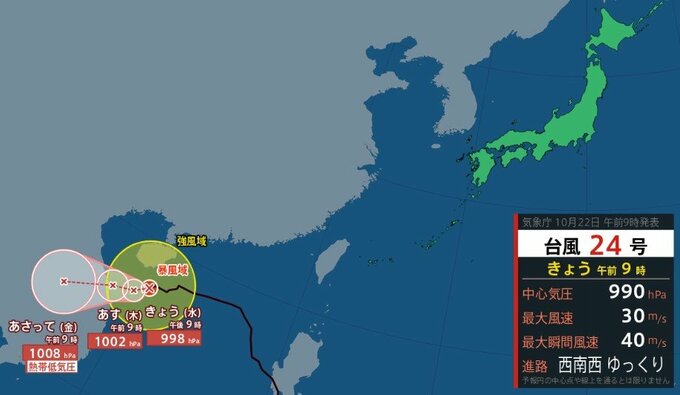 気象庁によりますと、22日午前9時現在、台風24号(フンシェン)の中心は北緯17度10分、東経110度30分に位置しています。中心気圧は990hPa、中心付近の最大風速は30m/s、最大瞬間風速は40m/sとなっています。 暴風域は台風の中心から全域55km、強風域は北側330km、南側280kmに広がっています。