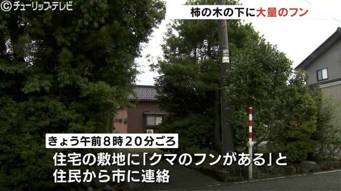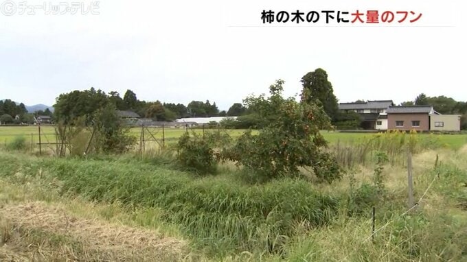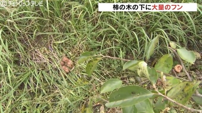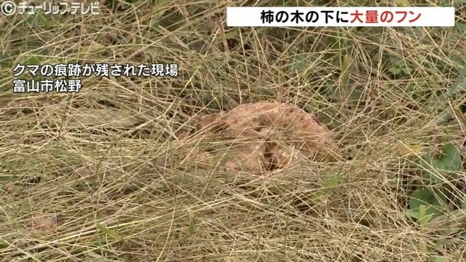 梶谷記者:「富山市松野です。こちらには草が踏み倒された跡があり道路を挟んですぐそばの柿の木の下にはクマのフンが大量に落ちています」