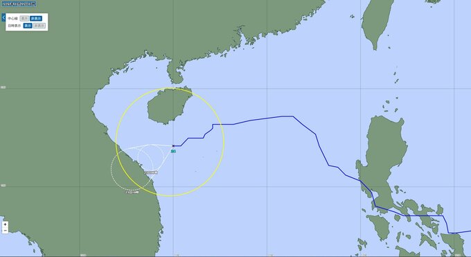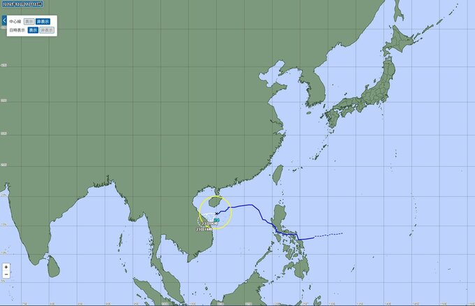 ▼23日午後6時には台風24号は熱帯低気圧に変わり、ベトナムに上陸する見込みです。中心位置は北緯15度55分、東経107度50分付近と予想されています。進行方向、速さは引き続き西南西、時速10kmの見込みです。