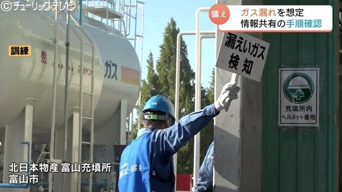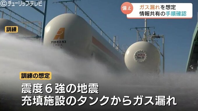 訓練は震度6強の地震で充填施設のタンクからガスが漏れたとの想定で行われ、警察や消防などが情報共有の手順を確認し放水。