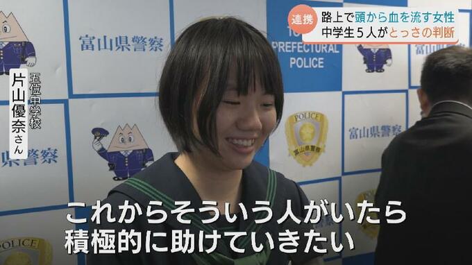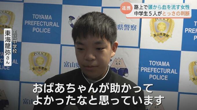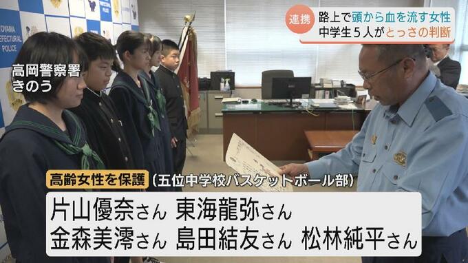 5人は9月24日、部活帰りに高岡市柴野内島の路上で、転んで頭から血を流している90代の女性を発見。