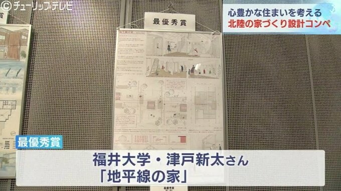 最優秀賞に選ばれたのは、福井大学・津戸新太さんの作品「地平線の家」で、境界線を作らない居住空間の魅力とプレゼン力が評価されました。