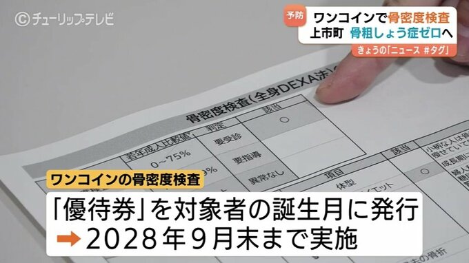 対象は上市町に住民票がある60~70代の男性と40~70代の女性で、通常4500円かかる骨密度検査を1回限定で500円で受けることができます。