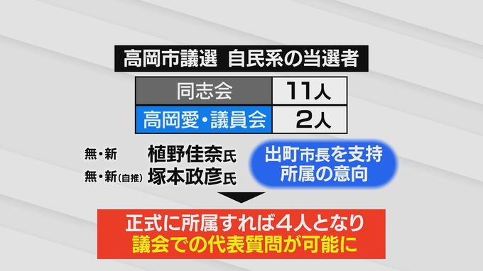 「高岡愛」に関しては、新人でトップ当選の植野さんと、塚本政彦さんが出町市長を支持し所属の意向を示しています。2人が正式に会派に入れば、「高岡愛」は4人となり、議会での代表質問が可能となります。