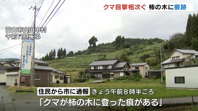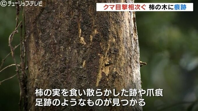 28日、午前8時半ごろ、富山市山田中村で地域住民から「クマがカキの木に登った痕がある」と地区センターを通じて市に通報がありました。現場からは、柿の実を食い荒らした跡や爪痕、足跡のようなものもみつかりました。
