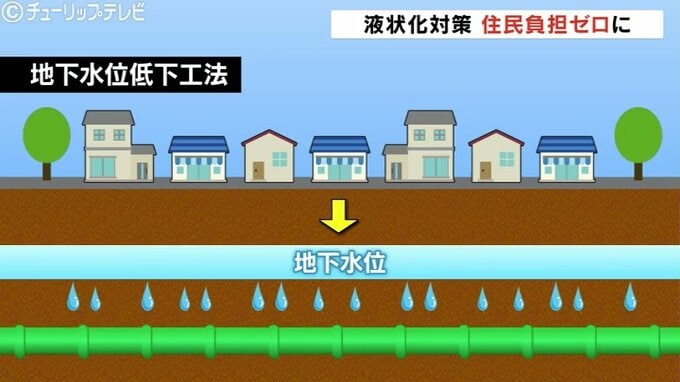 再液状化を防ぐ対策として道路の下に配水管を設置し一帯の水位を下げる「地下水位低下工法」の検討が進められていますが長期的にかかる維持管理費の負担が課題となっていました。
