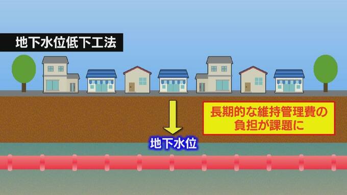 再液状化を防ぐ対策として、道路の下に集水管を設置し一帯の水位を下げる「地下水位低下工法」の検討が進められていますが、長期的にかかる維持管理費の負担が課題となっていました。