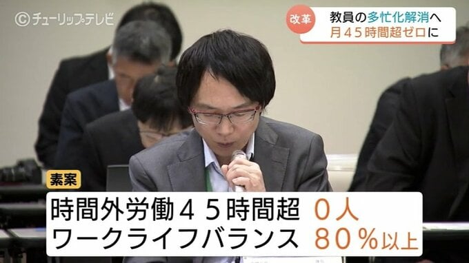 29日示された素案には、時間外労働時間が月45時間を超える教職員をゼロにすることや、ワークライフバランスがとれていると感じる教職員の割合を80パーセント以上にすることを目標として業務や行事の見直しを行うことが盛り込まれました。