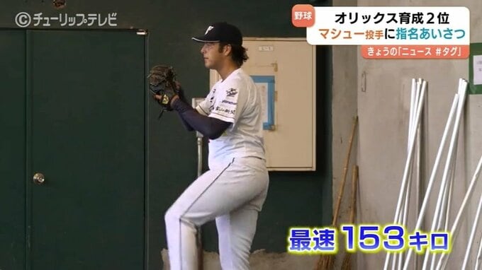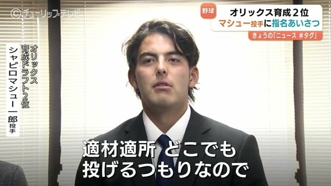 オリックスバファローズから育成ドラフトで指名された富山GRNサンダーバーズのシャピロ マシュー 一郎投手が29日、富山県高岡市内で指名あいさつを受けました。
