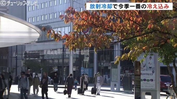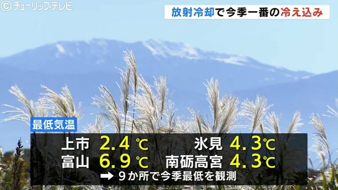 一方、朝は放射冷却現象の影響で冷え込み、最低気温は上市で2.4℃、氷見で4.3℃、富山で6.9℃など、10ある観測地点の9か所で今シーズンの最低気温を観測し、11月中旬から下旬並みの気温となりました。