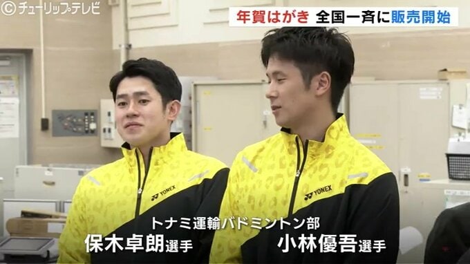 また、窓口にはセレモニーに参加したトナミ運輸バドミントン部の「ホキコバ」こと保木卓朗選手と小林優吾選手が立ち、購入者に干支のグッズなどが入った記念品を手渡していました。