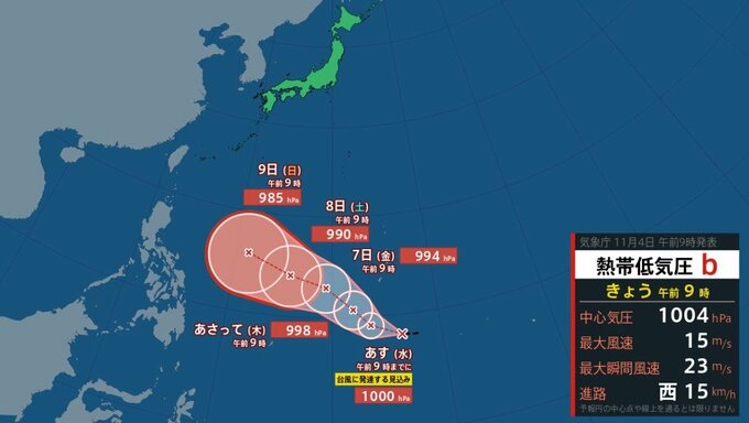 気象庁によりますと、熱帯低気圧は4日午前9時現在、カロリン諸島の北緯8度10分、東経146度25分を1時間に約15kmの速さで西へ進んでいます。中心気圧は1004hPa、中心付近の最大風速は15m/s、最大瞬間風速は23m/sとなっています。