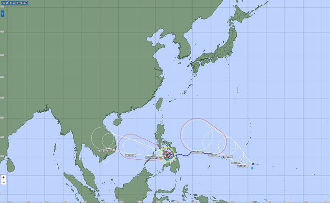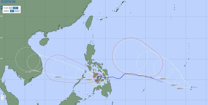 ▼5日午前9時には台風に発達し、カロリン諸島で西北西に進む見込みです。中心気圧は1000hPaに低下し、中心付近の最大風速は18m/s、最大瞬間風速は25m/sと予想されています。