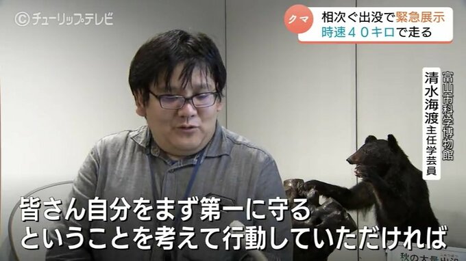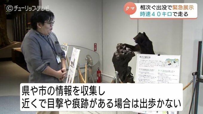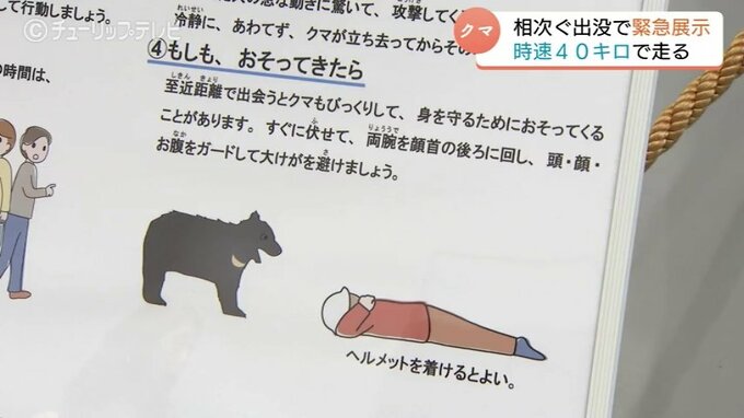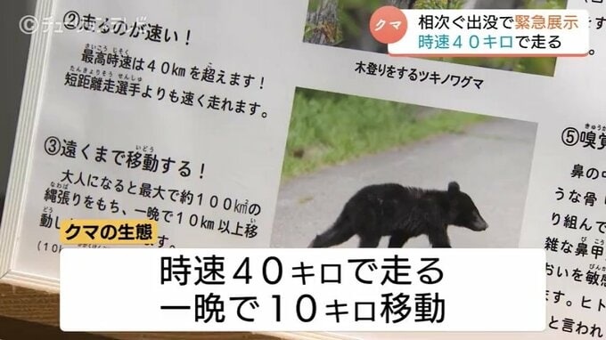 展示では、クマが時速40キロで走り、一晩で10キロ移動するという生態のほかクマと出合わないために出没情報がある場所には近づかないことやクマが活動しやすい朝夕の外出を控えるなど対策がまとめられています。
