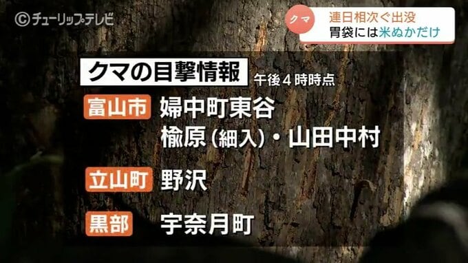このほか立山町や黒部市でもクマの出没が相次ぎました。富山県内では先月1か月間でクマの出没が410件と「準大量出没」だったおととしを大きく上回っています。