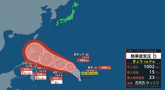 気象庁によりますと、熱帯低気圧は5日午前9時現在、カロリン諸島の北緯7度50分、東経143度00分を西南西にゆっくりと進んでいます。中心気圧は1002hPa、中心付近の最大風速は15m/s、最大瞬間風速は23m/sとなっています。