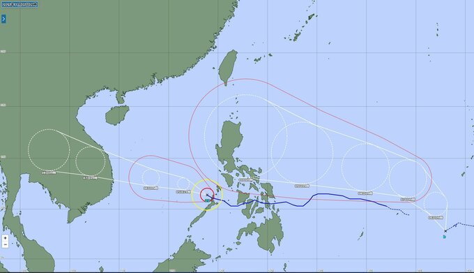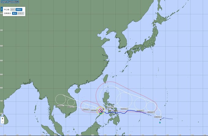 台風の予報進路は、予報の期間が長くなるほど誤差の幅(予報円)が大きくなります。最新の情報を確認するようにしてください。