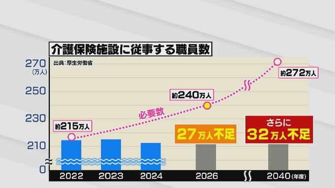厚労省によりますと、昨年度(2024年度)の介護職員数は213万人ですが、来年度(2026年度)は240万人の介護職員が必要と予想され、このままだと27万人が不足する見込みとなっています。
