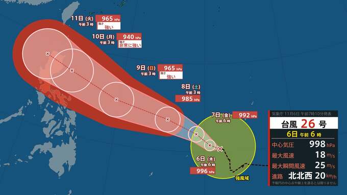 7日午前3時には、フィリピンの東の北緯11度35分、東経139度55分付近に達する見込みです。中心気圧は992ヘクトパスカル、中心付近の最大風速は23メートル、最大瞬間風速は35メートルに強まると予想されています。