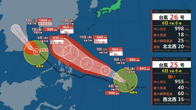 ▼台風25号(カルマエギ)は6日午前6時現在、南シナ海を西北西に時速35キロで進んでいます。中心気圧は955ヘクトパスカル、中心付近の最大風速は40メートル、最大瞬間風速は60メートルとなっています。