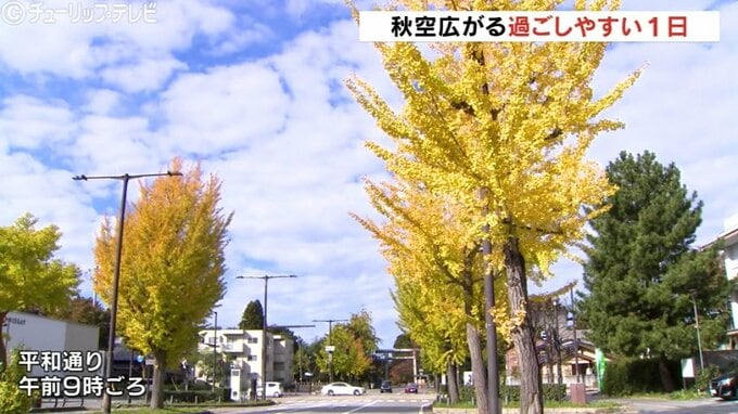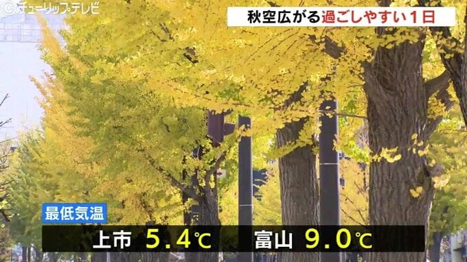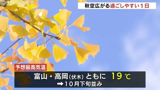 県内は昼過ぎからもくもりまたは晴れとなる見込みで、日中の最高気温は富山・高岡市伏木ともに19℃と10月下旬並みの暖かさとなる見込みです。