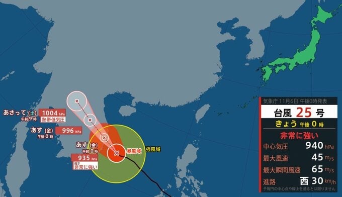気象庁によりますと、非常に強い台風25号(カルマエギ)は6日正午現在、南シナ海を時速30kmで西に進んでいます。中心気圧は940hPa、中心付近の最大風速は45m/s、最大瞬間風速は65m/sとなっています。