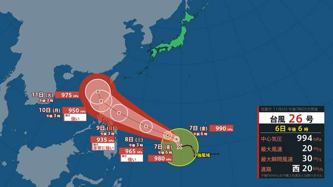 気象庁によりますと、台風26号は6日午後6時現在、フィリピンの東の海上にあり、西に時速20キロで進んでいます。中心気圧は994ヘクトパスカル、中心付近の最大風速は20メートル、最大瞬間風速は30メートルとなっています。