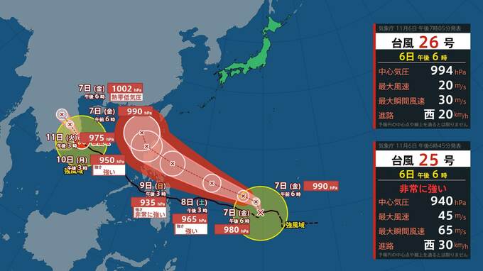 フィリピンの東と南シナ海にそれぞれ台風26号(フォンウォン)と台風25号(カルマエギ)が存在しています。特に台風26号は今後急速に発達し、「非常に強い」勢力になる見込みです。