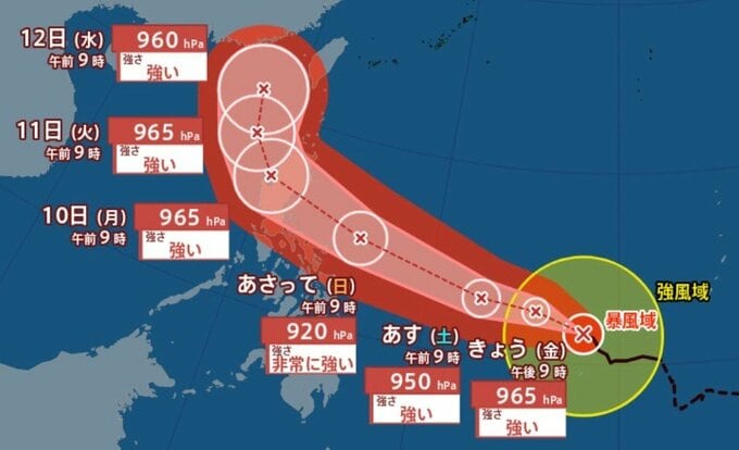 ▼10日午前9時には南シナ海に達し、中心気圧965hPa、中心付近の最大風速35m/s、最大瞬間風速50m/sと、再び「強い」勢力に弱まる見込みです。