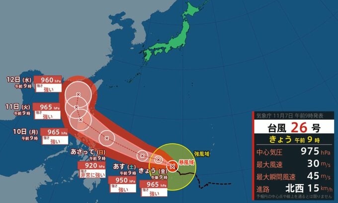 ▼9日午前9時には、台風26号は「非常に強い」勢力に発達し、中心気圧が920hPaまで急激に低下する見込みです。中心付近の最大風速は50m/s、最大瞬間風速は70m/sに達する予想で、フィリピンの東を西北西に時速30kmで進む見通しです。