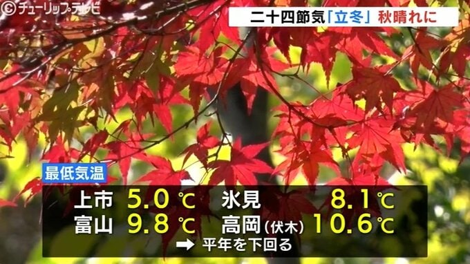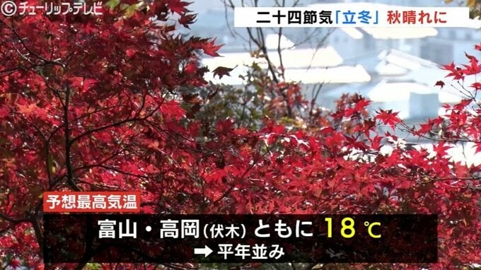 暦の上で11月7日は、二十四節気の一つで冬の始まりを表す “立冬” です。富山県内は朝から冷え込みましたが、日の差すところもあり、この時期らしい気温となっています。