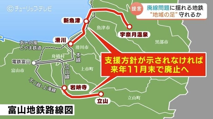 地鉄は、年内に行政から明確な支援の方針が示されなければ、本線の「滑川ー宇奈月温泉」間と立山線の「岩峅寺ー立山」間について、来年11月末で廃止する方針を示しました。